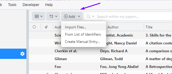 With that file saved, head to the Papers desktop application – you do need to use the desktop application for this import, not the web. Once there, head to add – import files