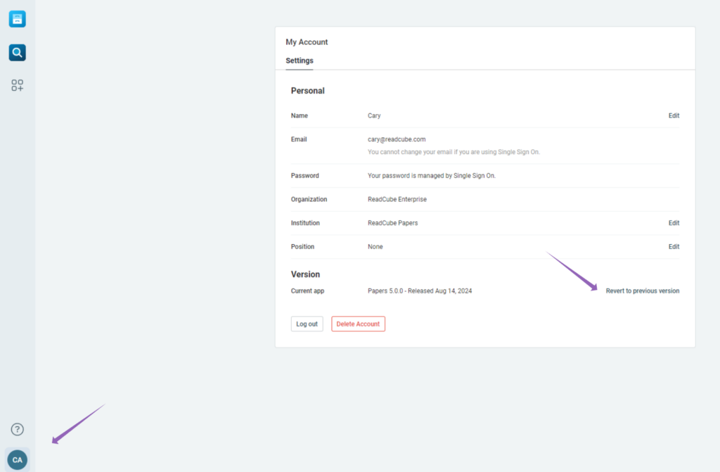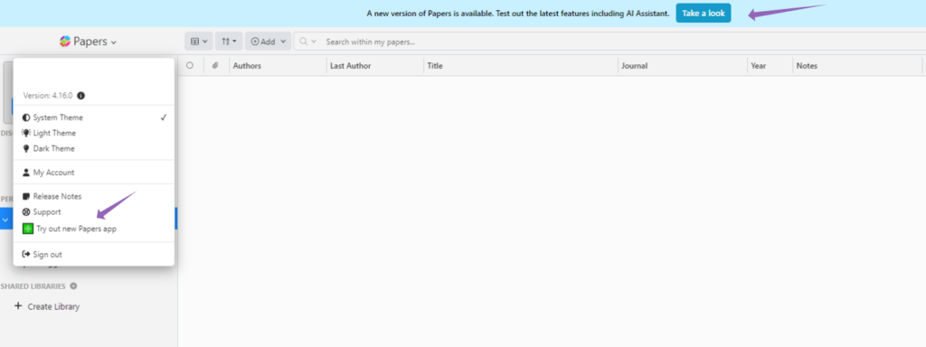 You can also revert back to the latest version of Papers by navigating to the Settings of the app, or, clicking the banner at the top of the app window