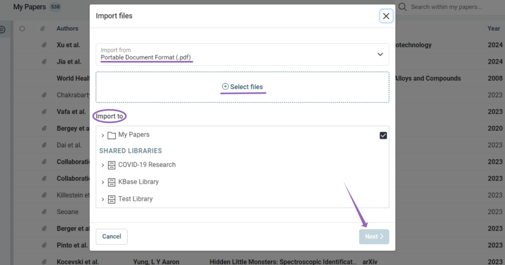 Uploading any existing PDF articles into your Papers library is easy. Simply click on the “+” button in the top right corner, select “Import Files” and then import PDFs directly from local storage: