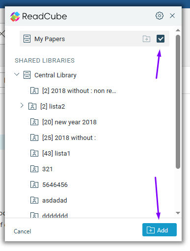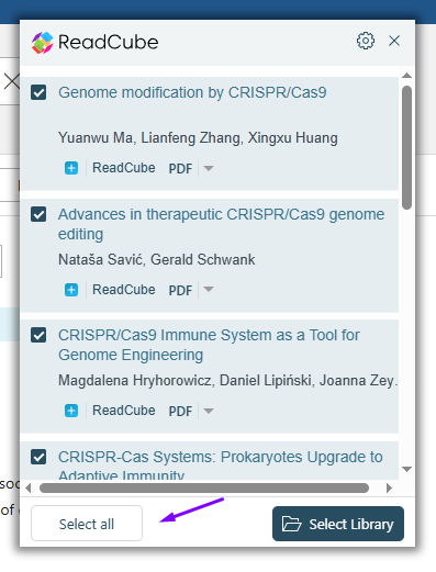 To import multiple articles at once, head into the Papers extension on your browser (this option is usually on the upper right hand side of your browser window). Here, you can select multiple references, or all search results