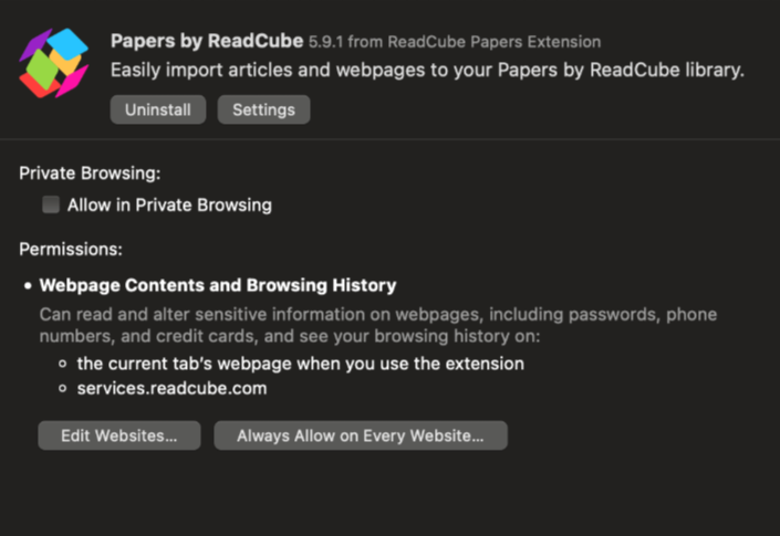The Papers browser extension allows you to seamlessly import articles to your library directly from your web browser. Find papers as you normally would on Dimensions, PubMed, Google Scholar and journal websites, then add them to your ReadCube library using the browser extension. References can be added to any of the lists in your library, along with optional notes, and the extension will automatically import the associated PDF, if possible.