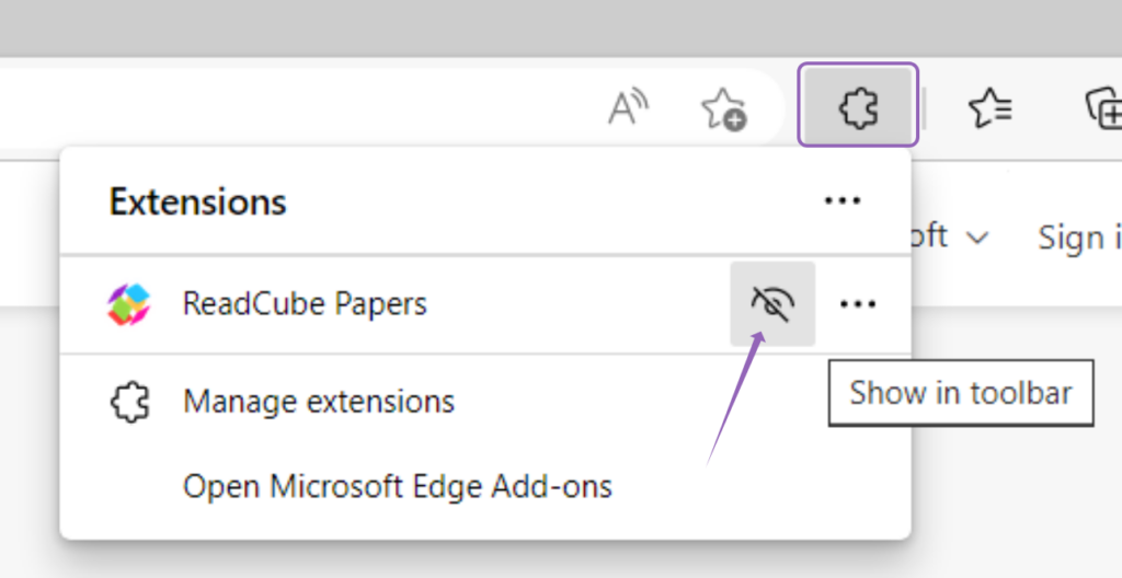 - The extension will then be added and you can pin it to your taskbar by clicking on the “Extensions” icon and selecting the “Show in toolbar” button: