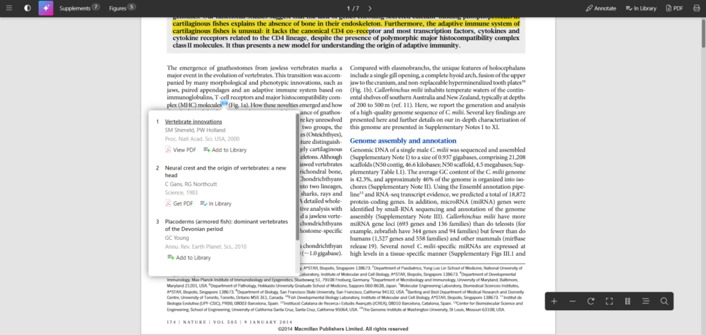 When you select an inline citation, you will get a popup listing the included reference(s). Papers will recognize any articles or citations you already have in your library and mark it with the “In Library” field.