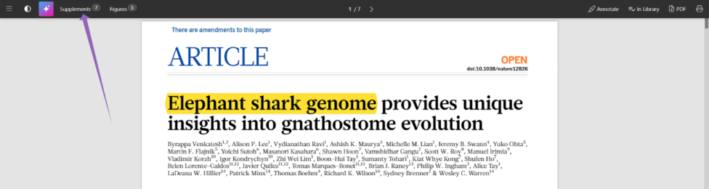 If an article has supplemental files available, you’ll see a number in the top-left menu bar indicating the total number of available files. Follow these steps to access them: