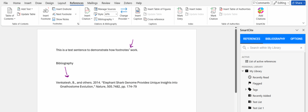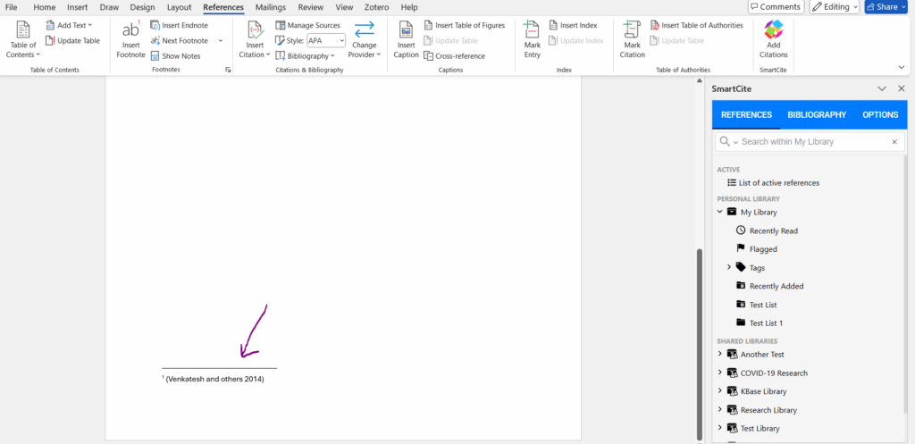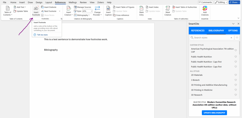 Once a footnote has been inserted in-text, navigate to the bottom of the page where the citation will be located, then input it from your library in SmartCite by going to the References tab in SmartCite. When you select the citation, it will be added to the footnote, and an entry will be generated for the bibliography section.