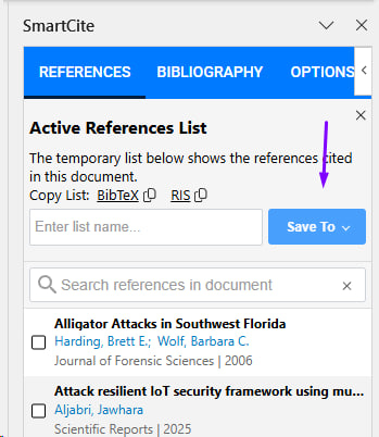 - Use the “List of active references” tool in SmartCite under the REFERENCES tab.