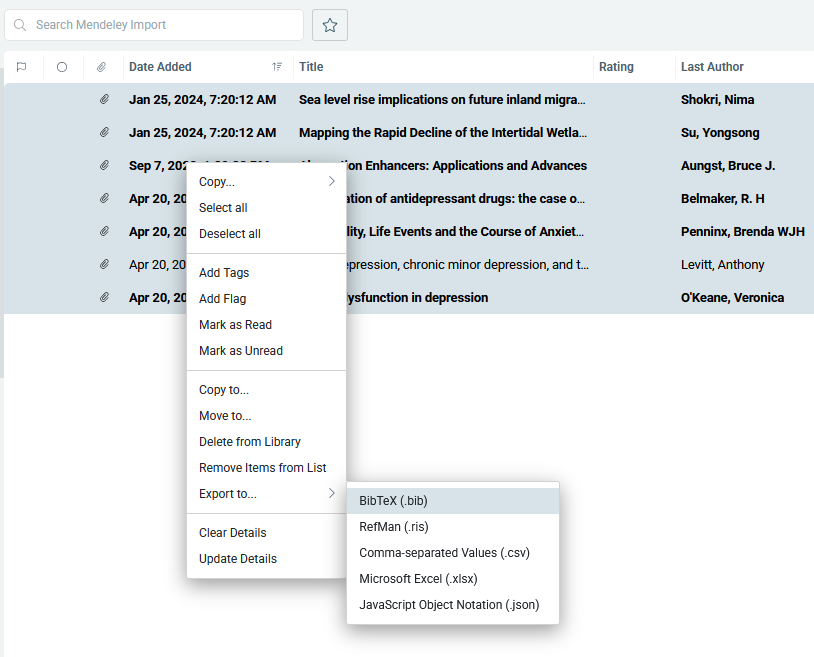 - Right-click the selected items to reveal the secondary menu. Choose EXPORT > BIB.