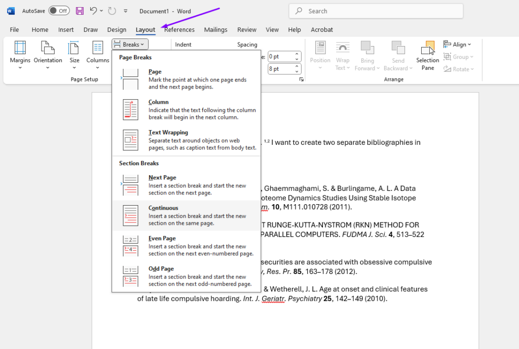 Once this feature is enabled, bibliographies will be divided by the document’s section breaks. Each section break will have its own incrementing list of citations and bibliography. In Word, go to the Layout tab and insert the section break of your choice.