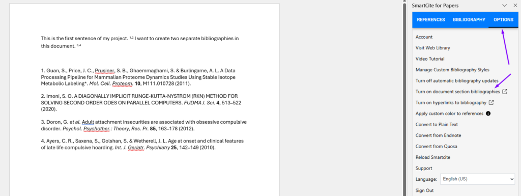 Scroll down and select Turn on document section bibliographies.