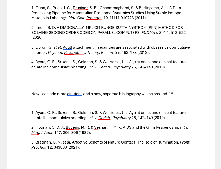 You can use SmartCite’s section bibliographies to achieve this. Once you’re ready to insert a second bibliography:
