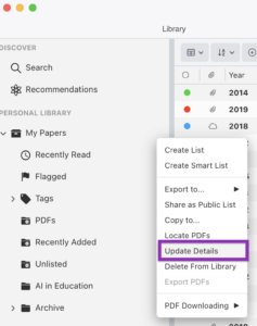 To check your library for retractions or other publisher changes, first update the metadata to make sure all of your information is current. Click on the cogwheel next to either the library or list and select “Update Details”. Next, identify retracted works by searching using the keyword “retracted” in the search bar in all of your libraries.