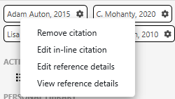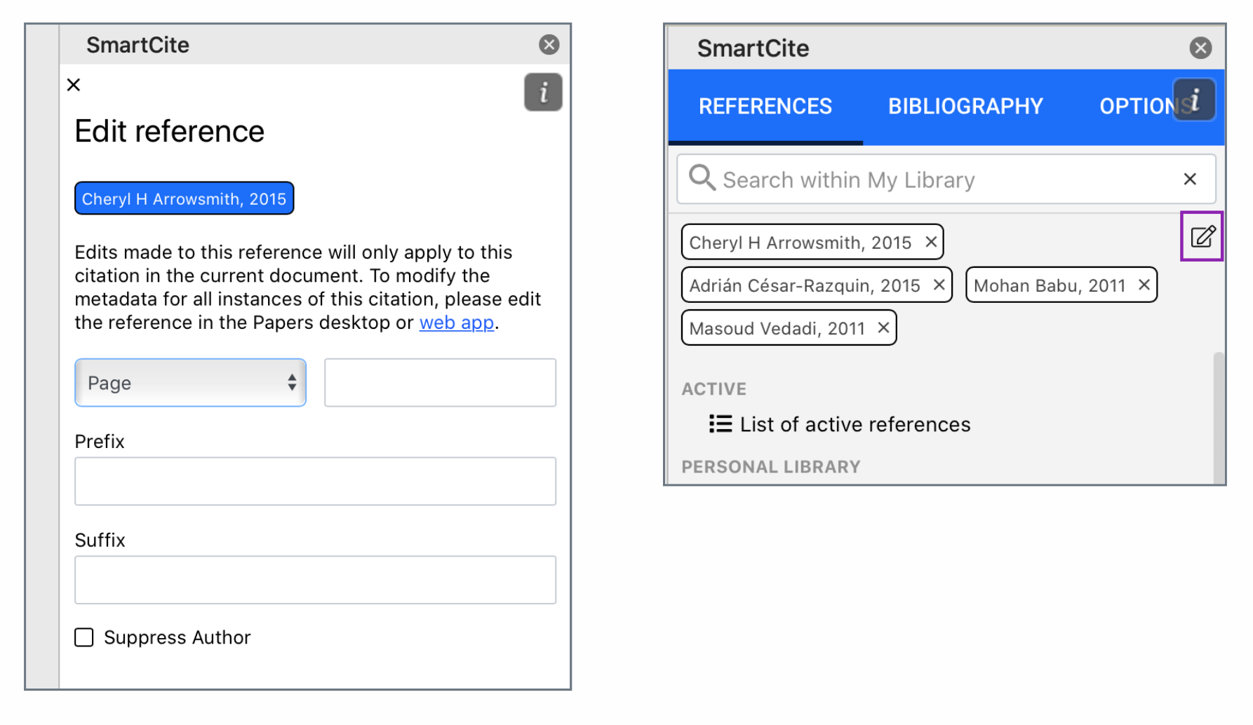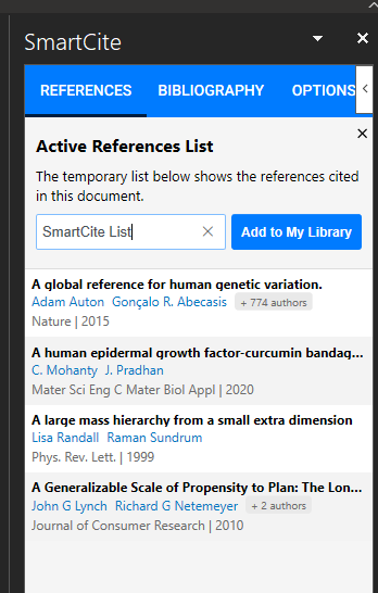 We’ve added it back! Now clicking on “List of active references” will allow you to create a list in your personal library with all of the references you were citing in SmartCite. We’ve also made the citation “pills” a little more intuitive. Click the gear or right-click to get more options.