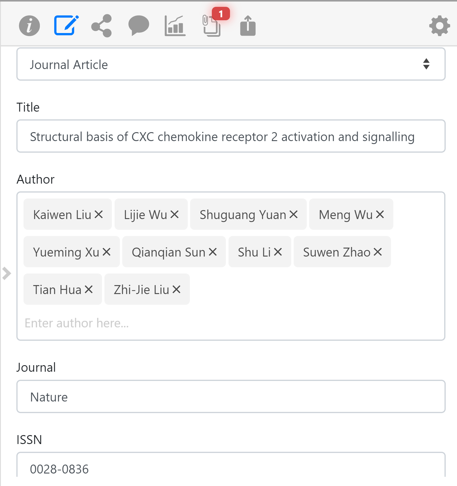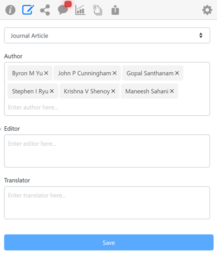 The ability to edit authors has been introduced. This took some more work but you can now adjust the name of an author and edit the order the authors order easily. We have also made this work on any field that has multiple names in the field(Editors, Inventors, contributors, etc.).