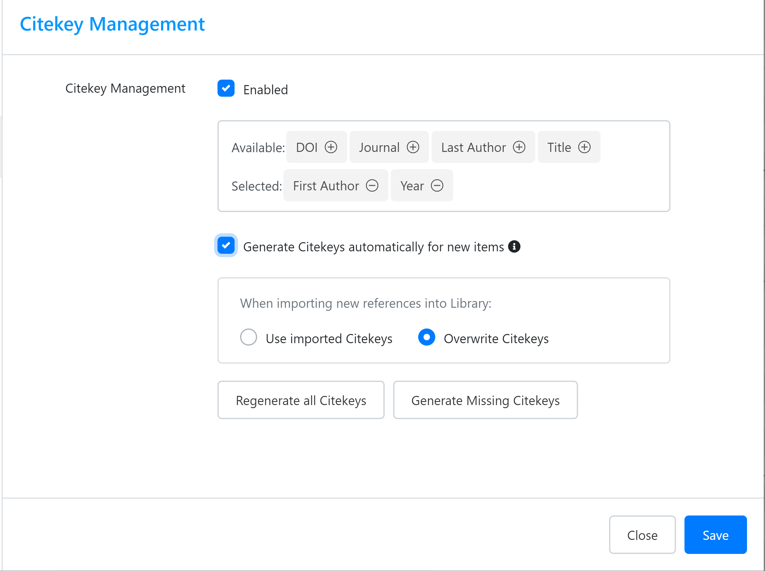 When importing items into your library you can choose to use the citekey that the item came with or choose to overwrite the citekey with the options you specified. You can also choose to regenerate all the citekeys in your library or if you are happy with your current citekeys you can generate only missing ones. You can currently only generate citekeys for your library but we will be adding support for shared libraries in the future.