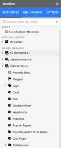 Then look for SmartCite under the Add-ons tab to open it up and just like that your personal and shared libraries sit side by side with your document!