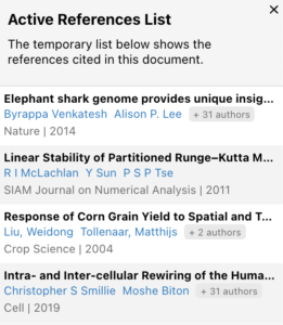 We’ve added in a new feature showing you all the active references you (and your colleagues) used throughout the document. Head to the Active References icon at the bottom of SmartCite to see your full list.