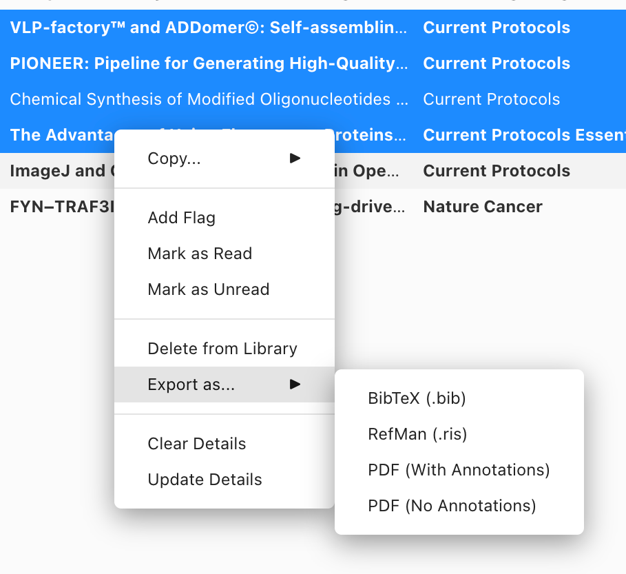 Simply highlight multiple articles in your library, right click and go to Export as… to see the new export options. If you have annotated any of the PDFs you have the option to export the PDF file with or without annotations.