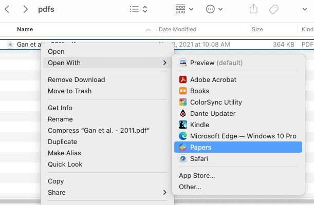 For Mac users, you can now easily open PDF files with Papers directly from the Finder. Simply right-click a PDF file, go to Open With and select Papers from the list of applications.