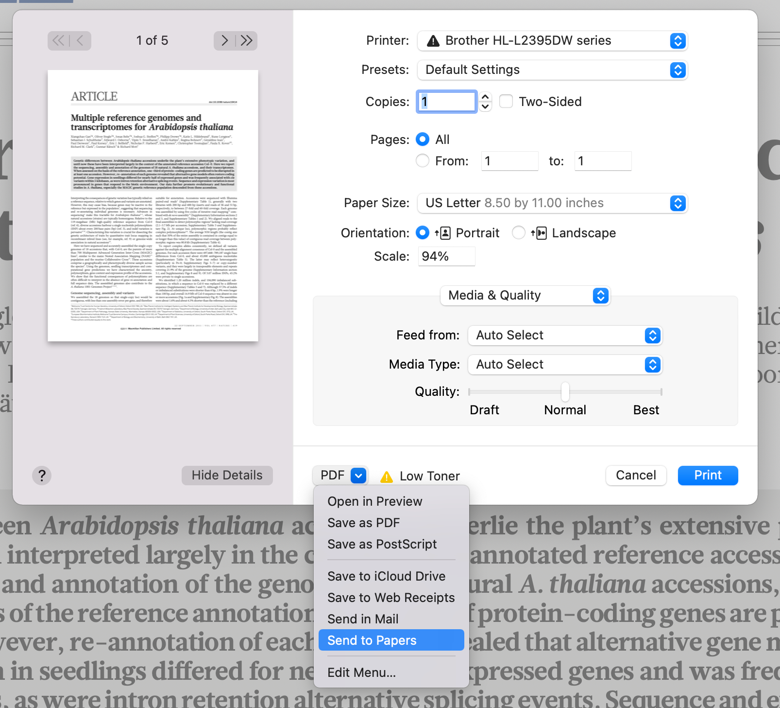 On Mac OS, you have a new way to send documents to Papers. From any application, go to Print and then choose the menu at the bottom to select “Send to Papers.” Your document will automatically be imported into your Papers library.