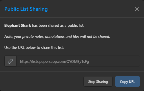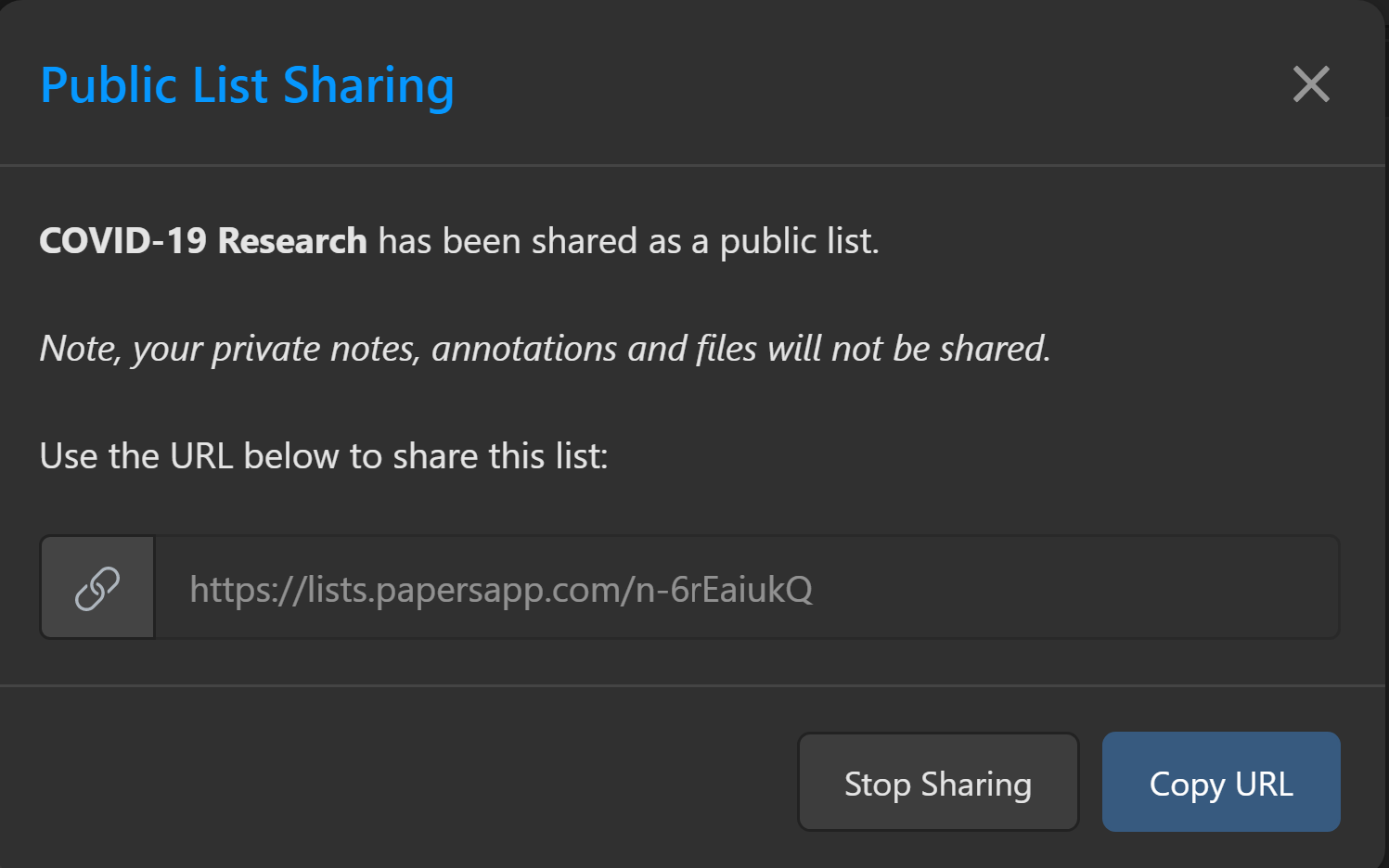 Have you ever had a list or library that you took hours to curate and wanted to share with the world? Public lists will allow you to do just that! To start, right-click on a list or your library and click “Share”. A dialog will pop up and if you click “Create Public List” it will give you the address of where people can find your public list. No one will have access to the PDFs or the annotations you made. This is simply sharing the metadata so people can check out your phenomenal curated library! They can view the PDFs if they are open access(without your annotations or notes) and export the list as a bib or ris file if they want to import it in their own library! You can stop sharing at any time by clicking share again and clicking “Stop Sharing”.