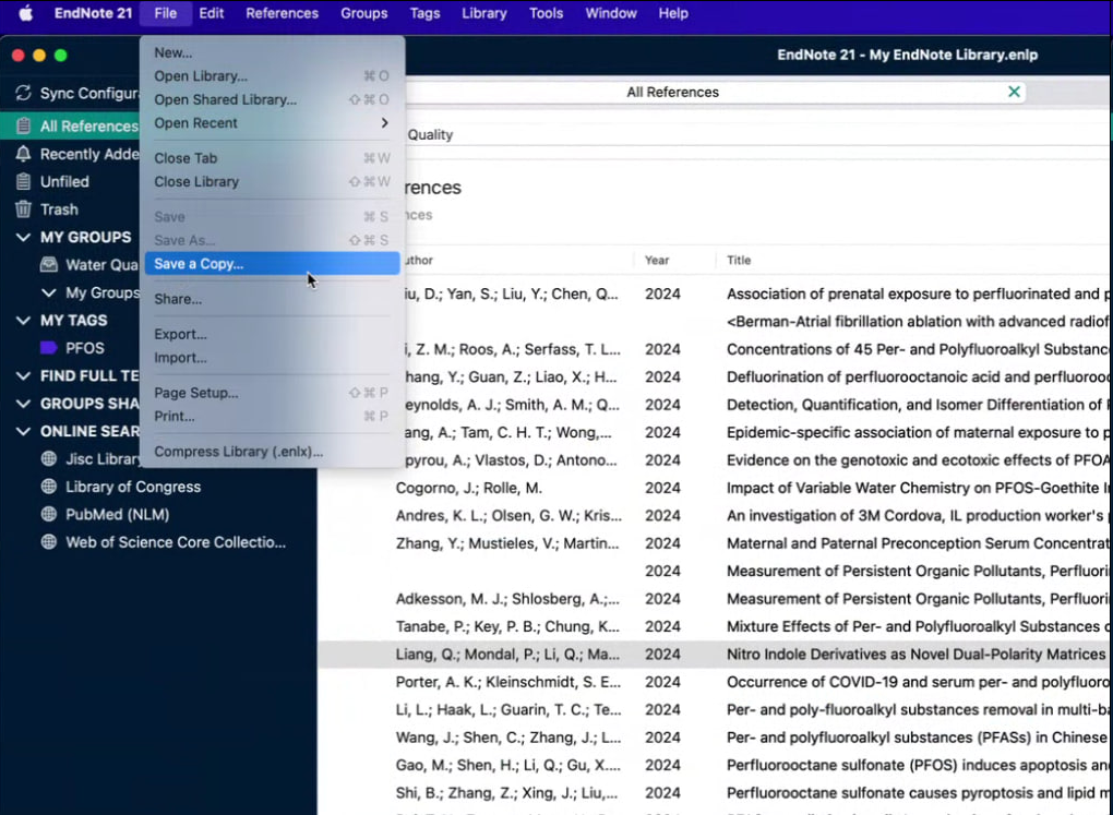 To begin, you’ll need to create an export file of your EndNote library. To do this, launch EndNote and head to file – save a copy