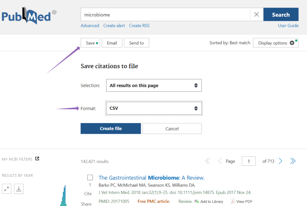 Another common CSV you might want to import is a PubMed search result. You can find this option under “Save” and by changing the format to CSV: